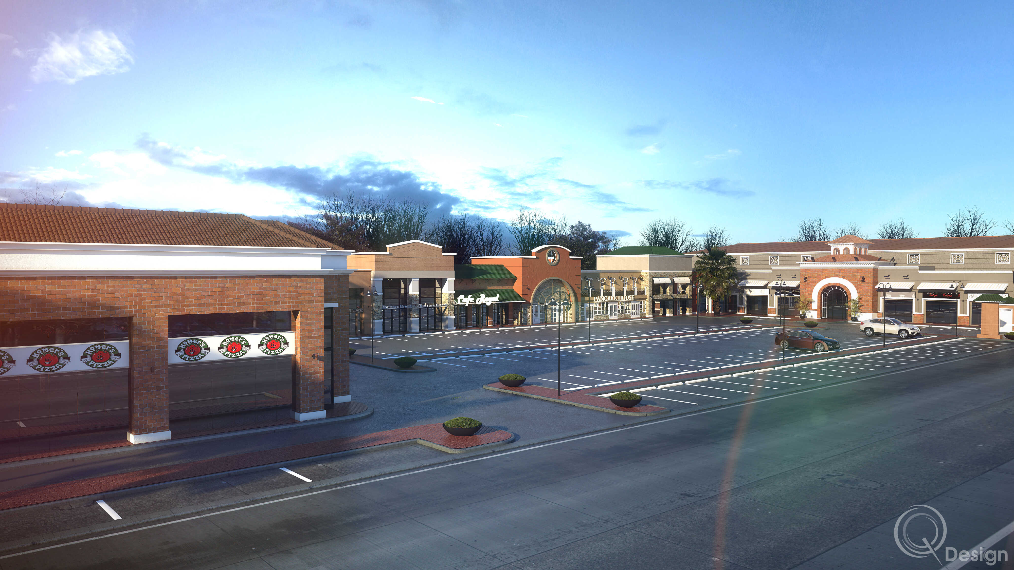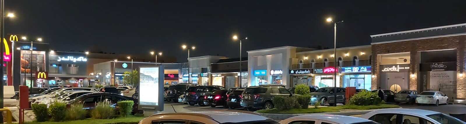 مجمع تجاري يحتوي محال تجاريه و مطاعم و سوبر ماركت مع الموقع العام و التشطيبات الخارجيه و الشبكات الكهروميكانيكيه